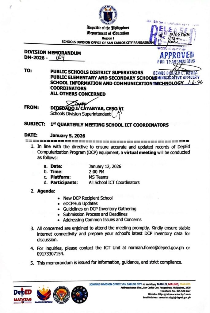 Division Memorandum No. 004 s, 2026 – 1st QUARTERLY MEETING SCHOOL ICT COORDINATORS