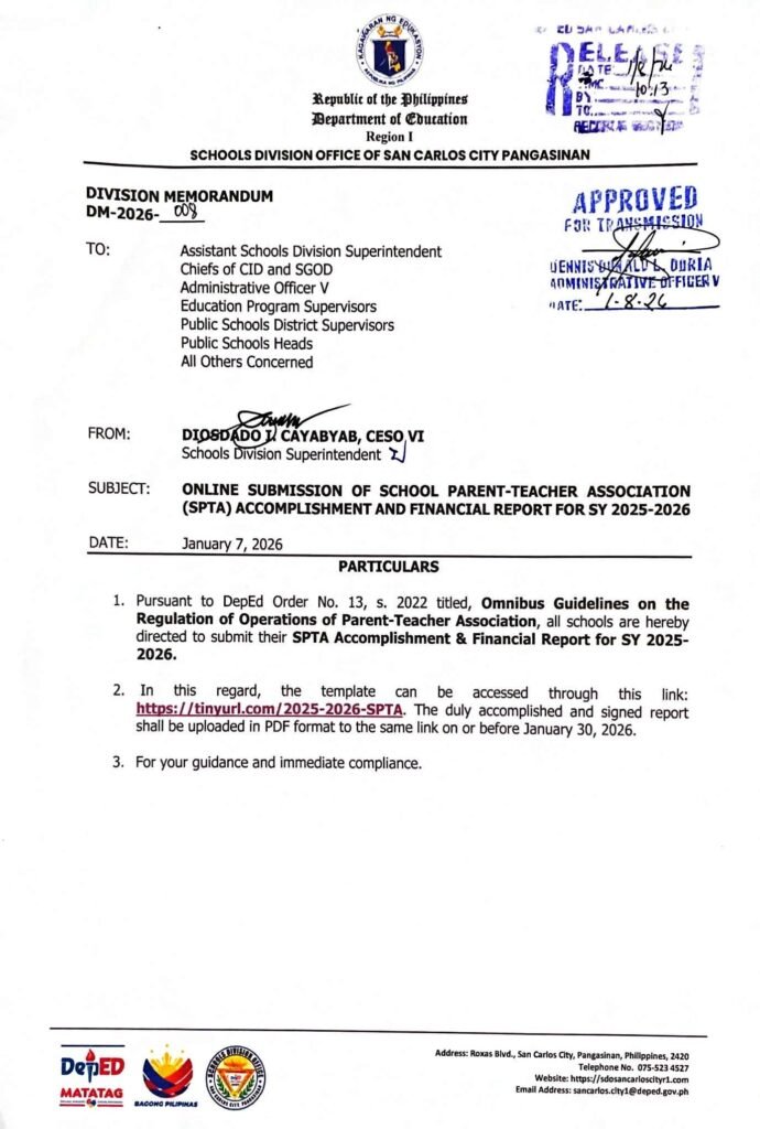 Division Memorandum No. 008 s, 2026 – ONLINE SUBMISSION OF SCHOOL PARENT-TEACHER ASSOCIATION (SPTA) ACCOMPLISHMENT AND FINANCIAL REPORT FOR SY 2025-2026