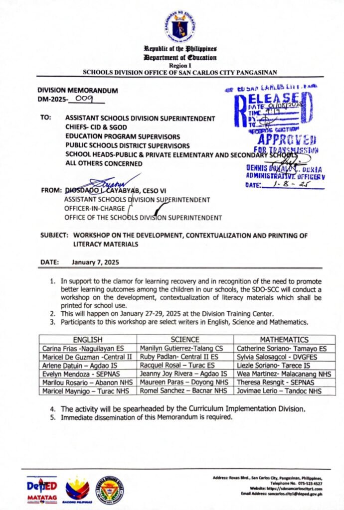 Division Memorandum No. 009 s, 2025 – Workshop on the Development, Contextualization and Printing of Literacy Materials