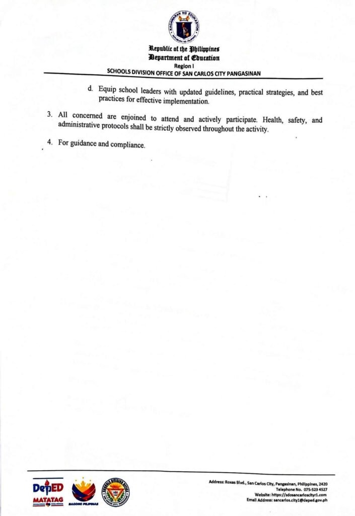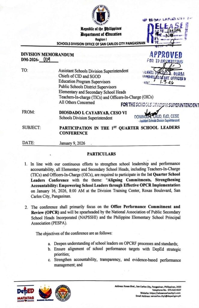 Division Memorandum No. 009 s, 2026 – PARTICIPATION IN THE 1st QUARTER SCHOOL LEADERS CONFERENCE
