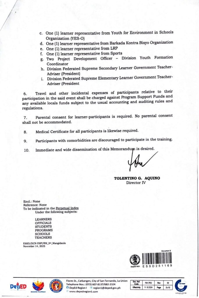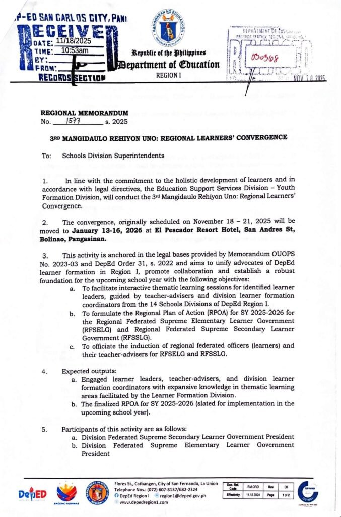 Division Memorandum No. 011 s, 2026 – PARTICIPATION IN THE 3rd MANGIDAULO REHIYON UNO: REGIONAL LEARNERS’ CONVERGENCE