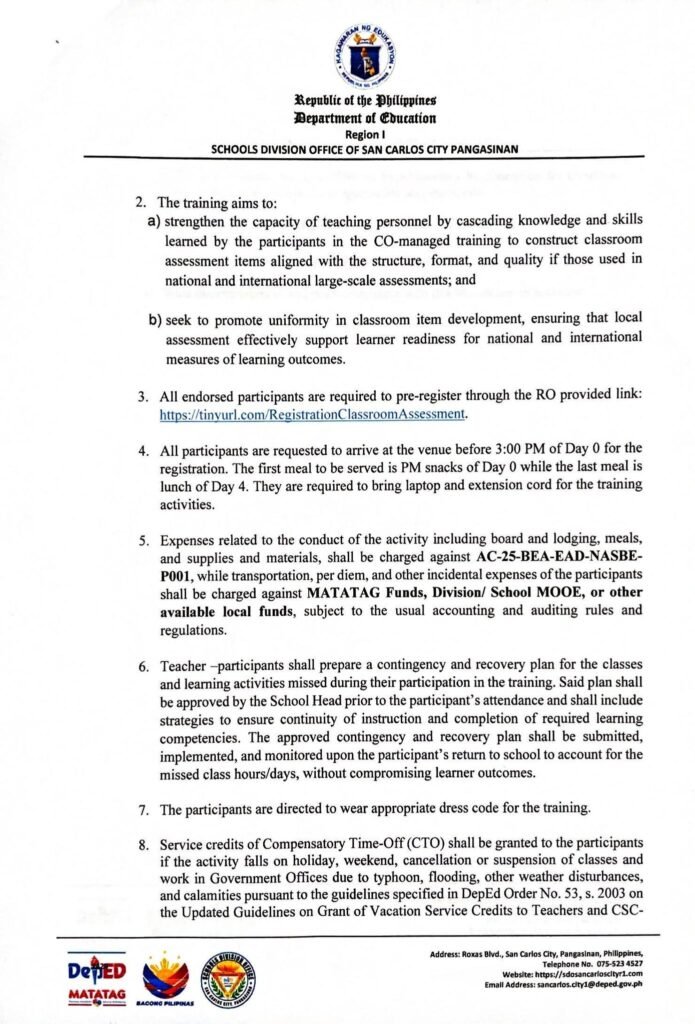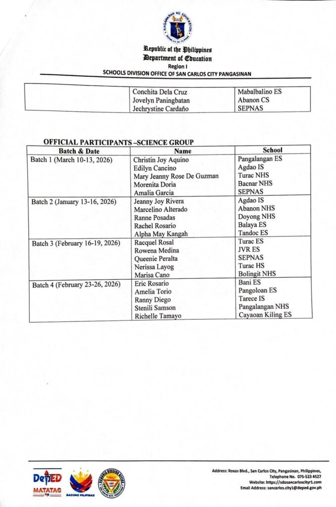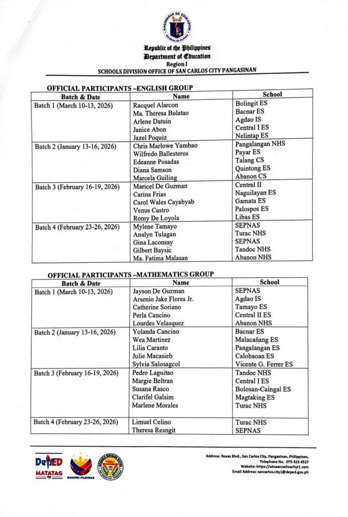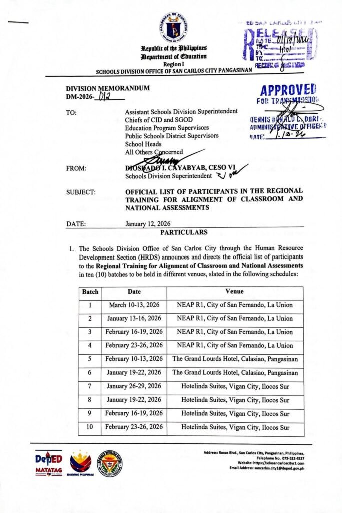 Division Memorandum No. 012 s, 2026 – OFFICIAL LIST OF PARTICIPANTS IN THE REGIONAL TRAINING FOR ALIGNMENT OF CLASSROOM AND NATIONAL ASSESSMENTS