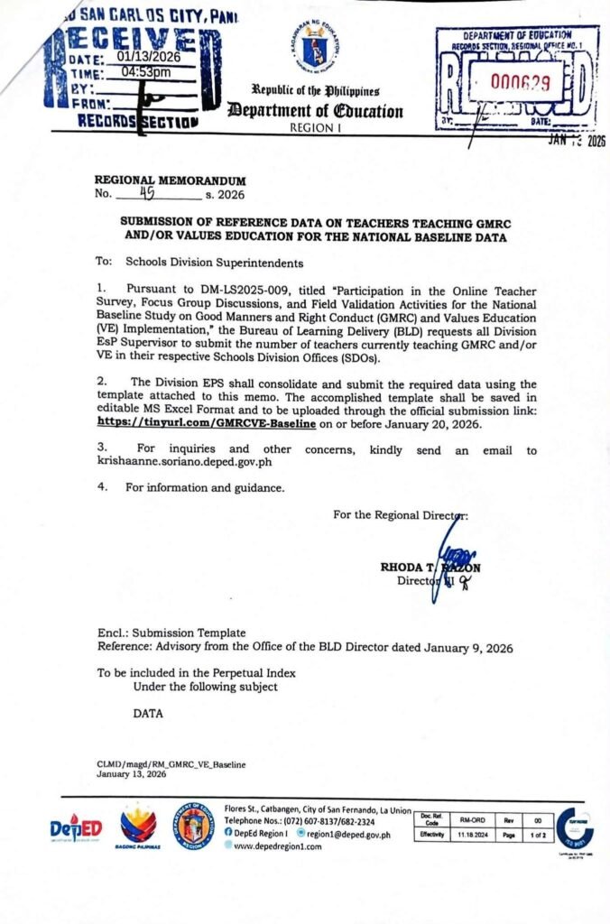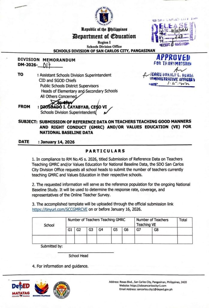 Division Memorandum No. 017 s, 2026 – SUBMISSION OF REFERENCE DATA ON TEACHERS TEACHING GOOD MANNERS AND RIGHT CONDUCT (GMRC) AND/OR VALUES EDUCATION (VE) FOR NATIONAL BASELINE DATA