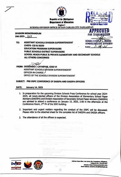 Division Memorandum No. 018 s, 2025 – PRE-DSPC CONFERENCE OF DASSPA AND DAESPA OFFICERS