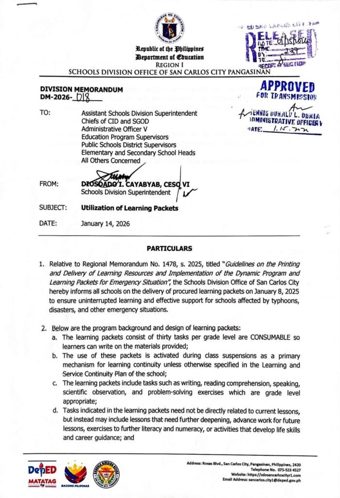 Division Memorandum No. 018 s, 2026 – Utilization of Learning Packets