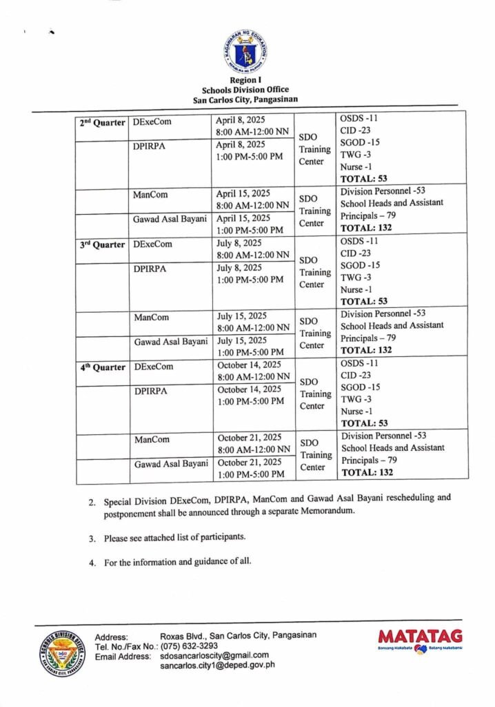Division Memorandum No. 023 s, 2025 – SCHEDULE OF QUARTERLY DIVISION EXECUTIVE COMMITTEE (DExeCom), DIVISION PROGRAM IMPLEMENTATION REVIEW AND PERFORMANCE ASSESSEMENT (DPIRPA), MANAGEMENT COMMITTEE (ManCom) MEETING AND GAWAD ASAL BAYANI FOR CALENDAR YEAR (CY) 2025