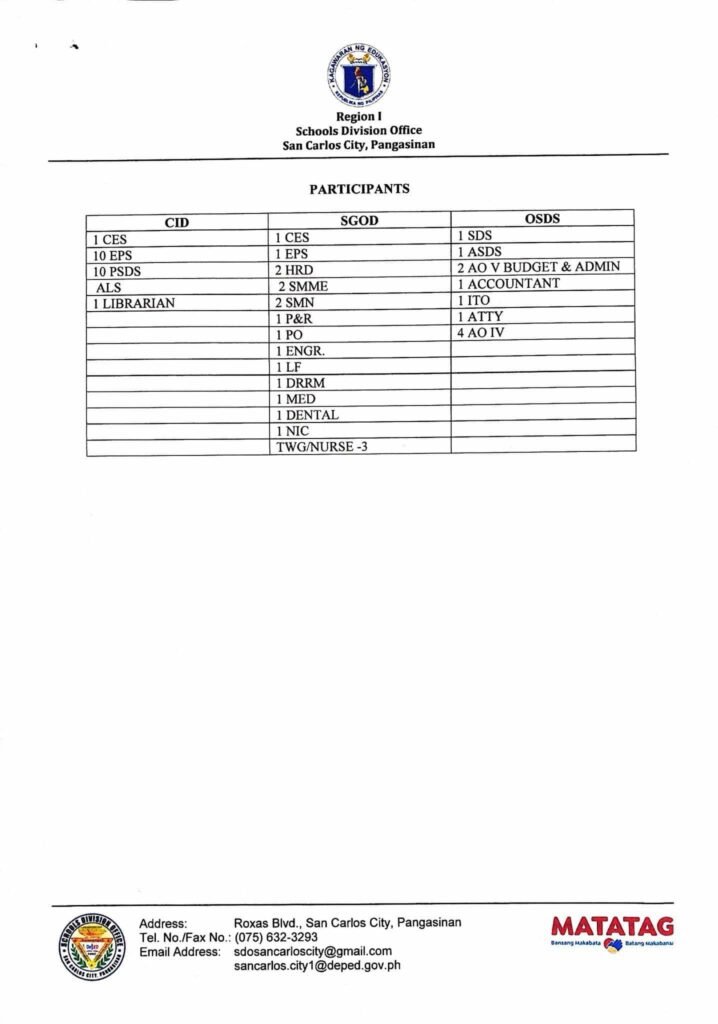 • Division Memorandum No. 070 s, 2026 – CONDUCT OF ONSITE VALIDATION FOR THE SEARCH FOR THE MOST OUTSTANDING SCHOOL-BASED FEEDING PROGRAM (SBFP) IMPLEMENTERS FOR SY 2025-2026, SEARCH FOR THE MOST FUNCTIONAL GULAYAN SA PAARALAN PROGRAM (GPP) IMPLEMENTERS FOR SY 2025-2026, AND PROGRESS MONITORING FOR CANTEEN OPERATIONS