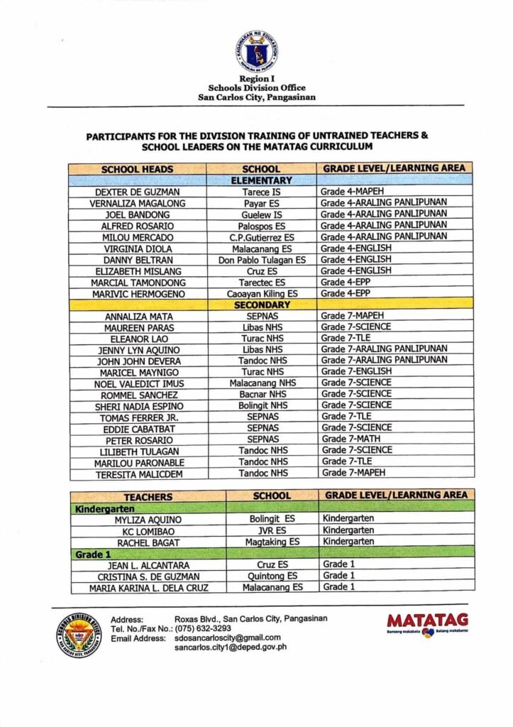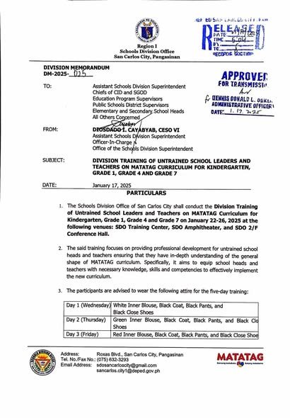 Division Memorandum No. 025 s, 2025 – DIVISION TRAINING OF UNTRAINED SCHOOL LEADERS AND TEACHERS ON MATATAG CURRICULUM FOR KINDERGARTEN, GRADE 1, GRADE 4 AND GRADE 7