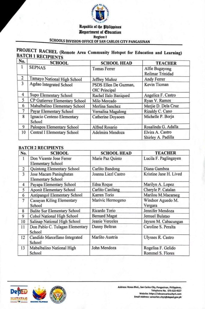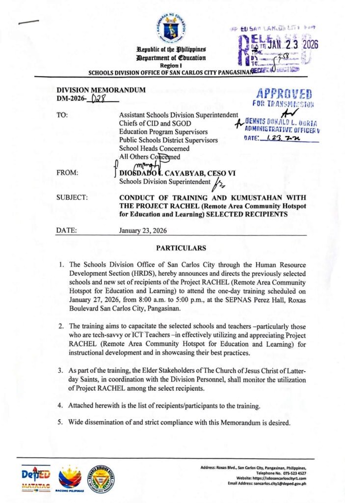 Division Memorandum No. 028 s, 2026 – CONDUCT OF TRAINING AND KUMUSTAHAN WITH THE PROJECT RACHEL (Remote Area Community Hotspot for Education and Learning) SELECTED RECIPIENTS