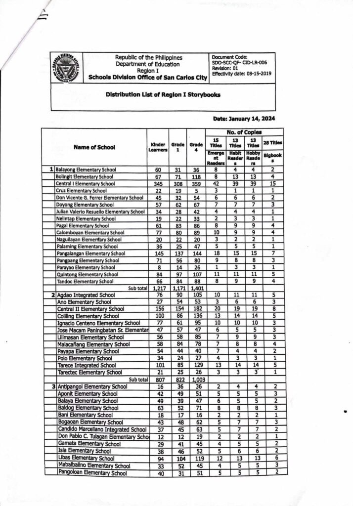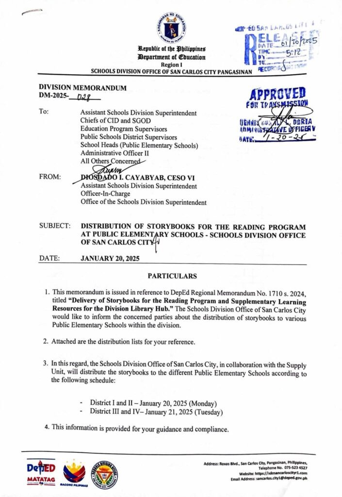 Division Memorandum No. 028 s, 2025 – DISTRIBUTION OF STORYBOOKS FOR THE READING PROGRAM AT PUBLIC ELEMENTARY SCHOOLS – SCHOOLS DIVISION OFFICE OF SAN CARLOS CITY