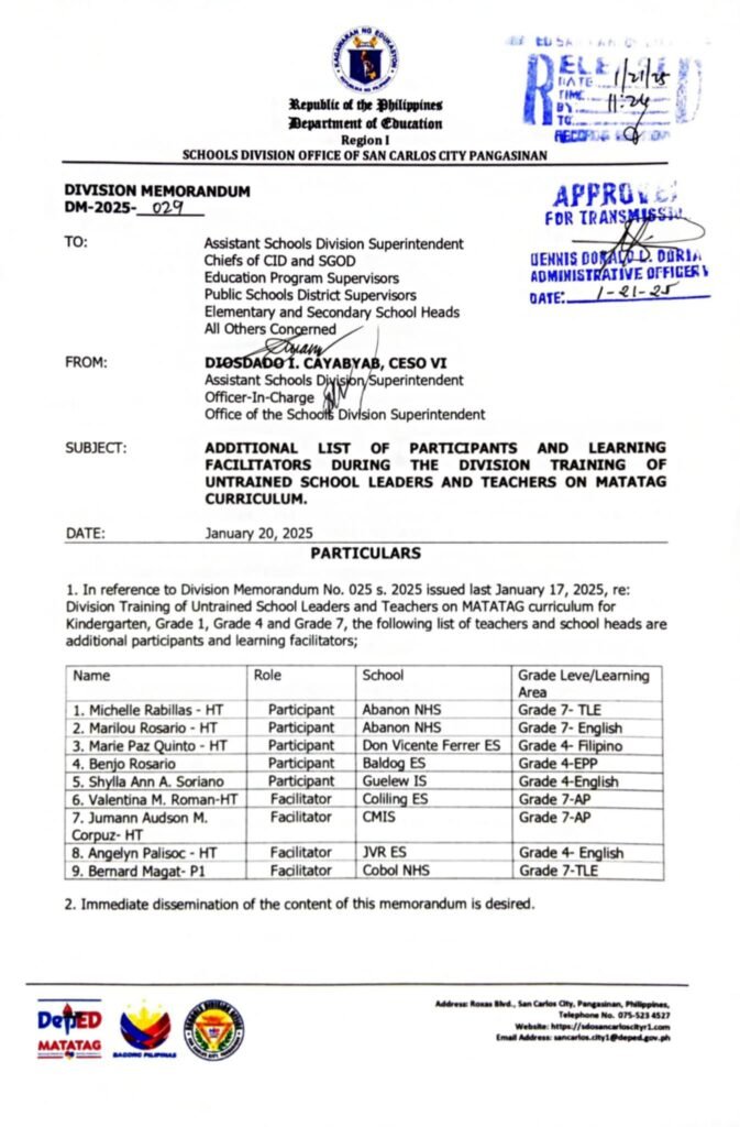 Division Memorandum No. 029 s, 2025 – Additional List of Participants and Learning Facilitators during the Division Training of Untrained School Leaders and Teachers on MATATAG Curriculum