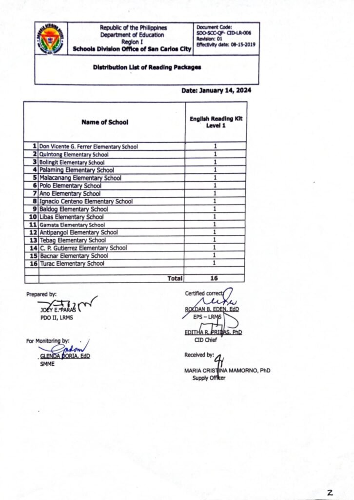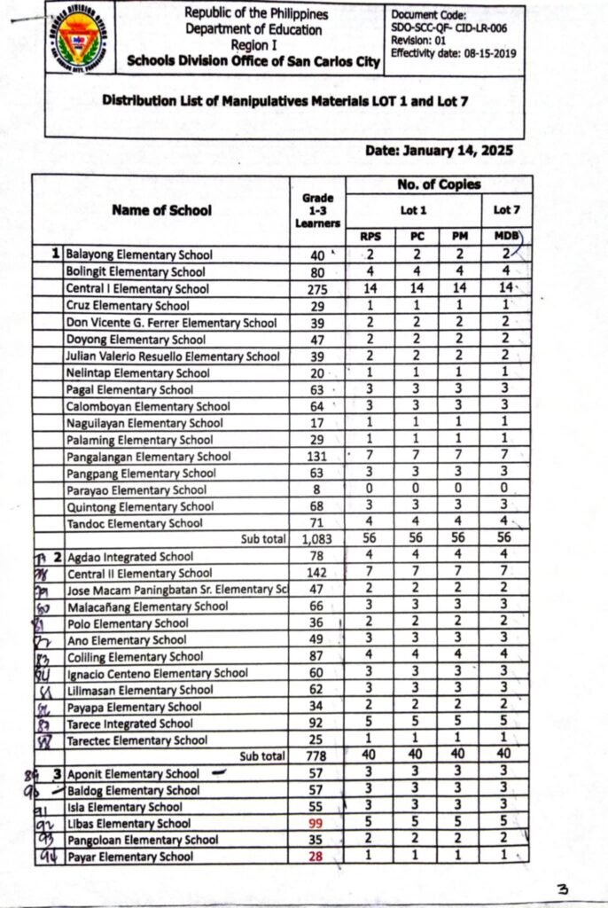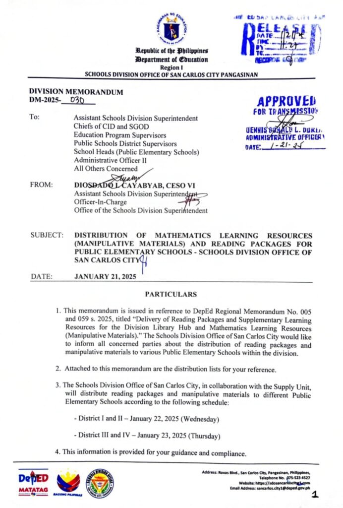 Division Memorandum No. 030 s, 2025 – Distribution of Mathematics Learning Resources (Manipulative Materials) and Reading Packages for Public Elementary Schools – Schools Division Office of San Carlos City
