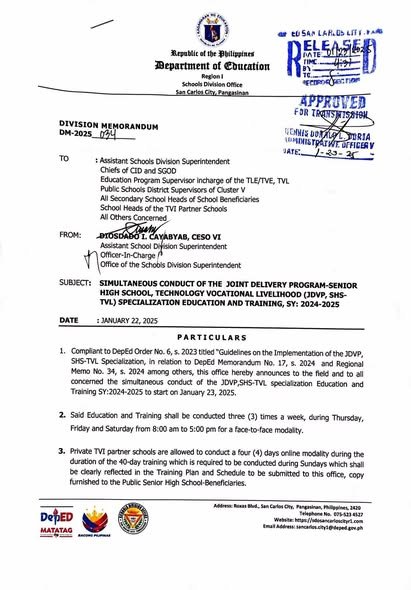Division Memorandum No. 034 s, 2025 – SIMULTANEOUS CONDUCT OF THE JOINT DELIVERY PROGRAM-SENIOR HIGH SCHOOL, TECHNOLOGY VOCATIONAL LIVELIHOOD (JDVP, SHS-TVL) SPECIALIZATION EDUCATION AND TRAINING, SY: 2024-2025