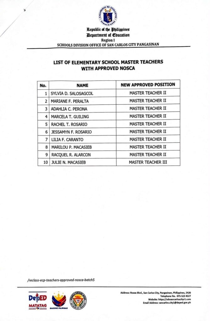 Division Memorandum No. 034 s, 2026 – LIST OF ELEMENTARY SCHOOL MASTER TEACHERS WITH APPROVED NOSCA BASED BASED ON APPROVED RECLASSIFICATION UNDER THE EXPANDED CAREER PROGESSION
