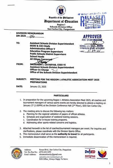 Division Memorandum No. 036 s, 2025 – MEETING FOR THE REGION 1 ATHLETIC ASSOCIATION MEET 2025 PREPARATIONS