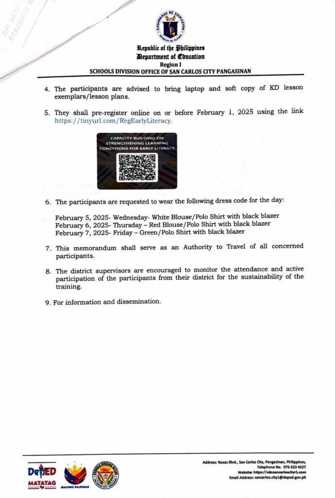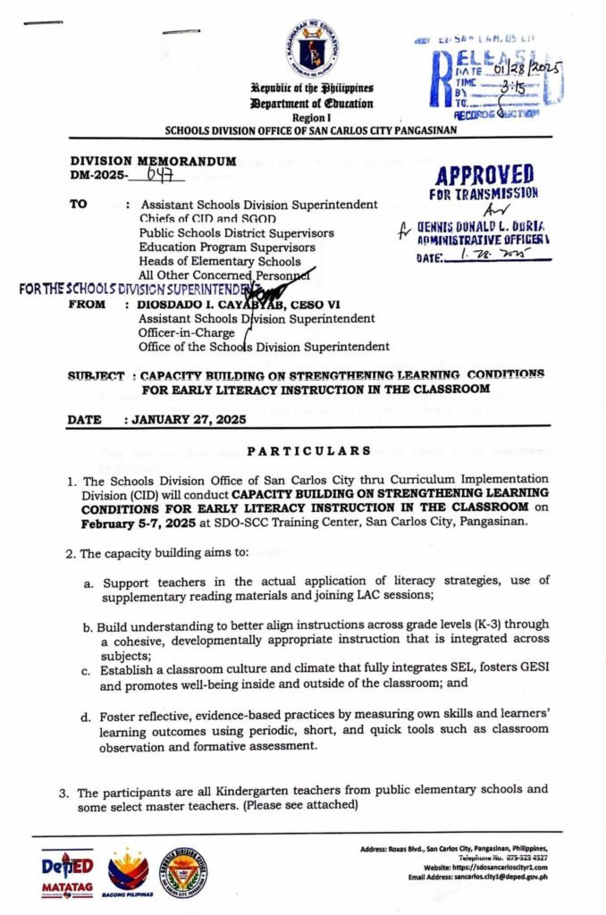 Division Memorandum No. 047 s, 2025 – CAPACITY BUILDING ON STRENGTHENING LEARNING CONDITIONS FOR EARLY LITERACY INSTRUCTION IN THE CLASSROOM