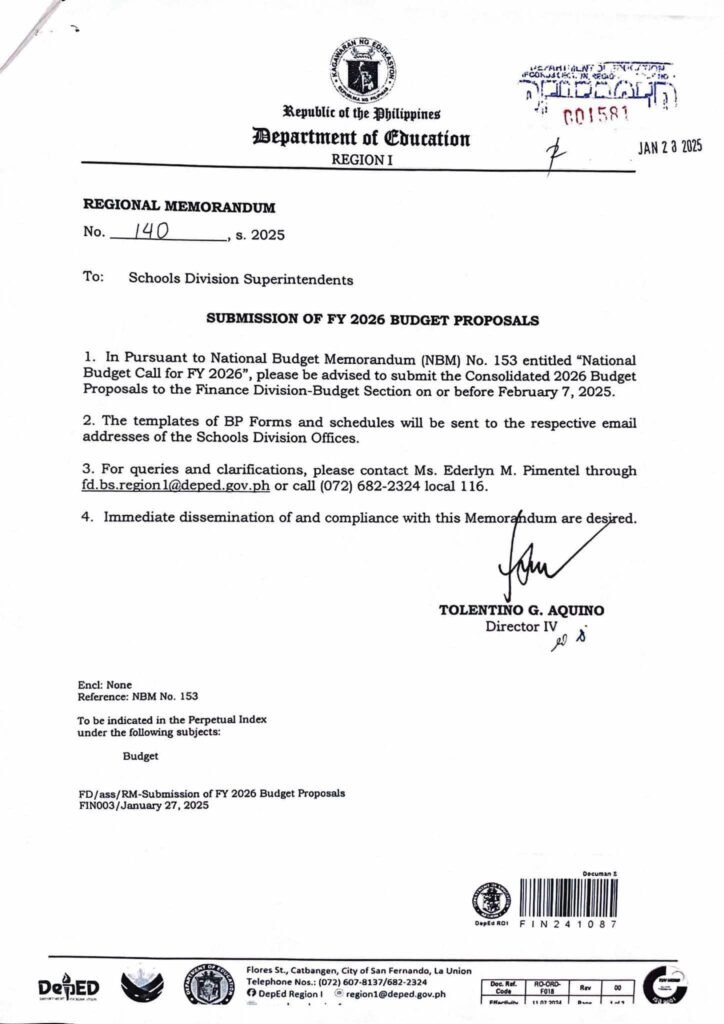 Division Memorandum No. 050 s, 2025 – FY 2026 BUDGET PROPOSAL SUBMISSION