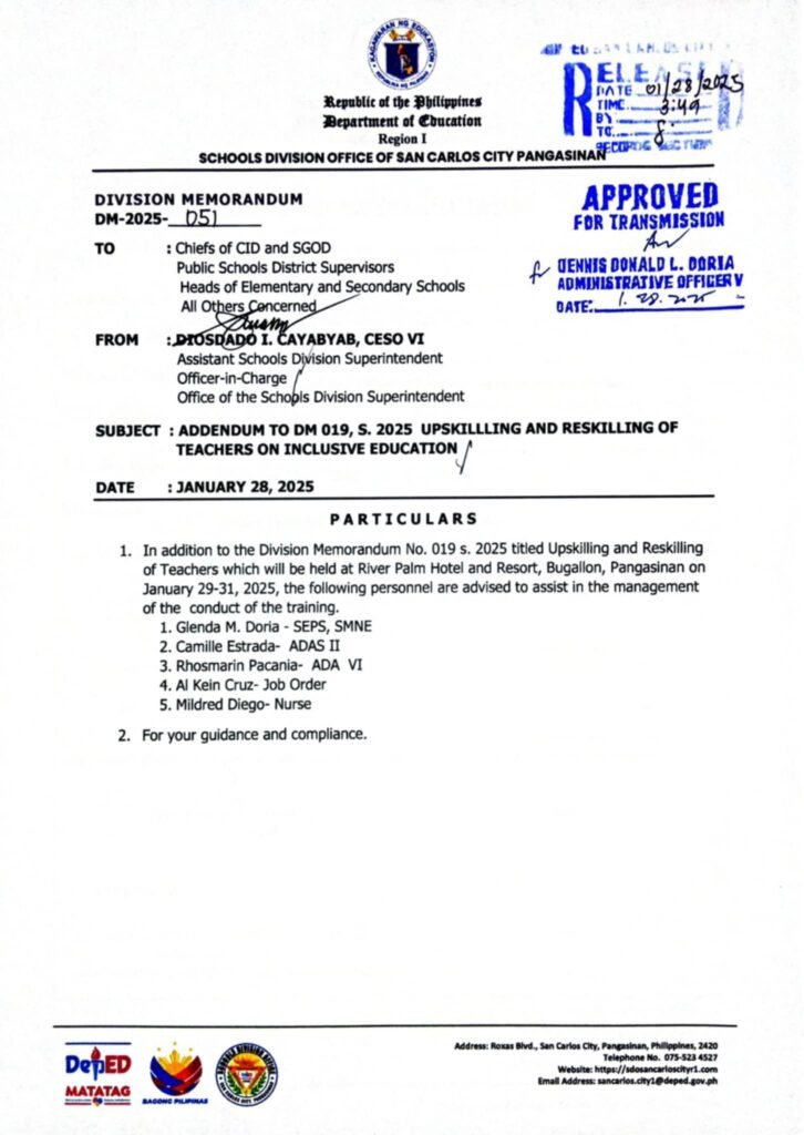Division Memorandum No. 051 s, 2025 – Addendum to DM No. 019, s. 2025 Upskilling and Reskilling of Teachers on Inclusive Education
