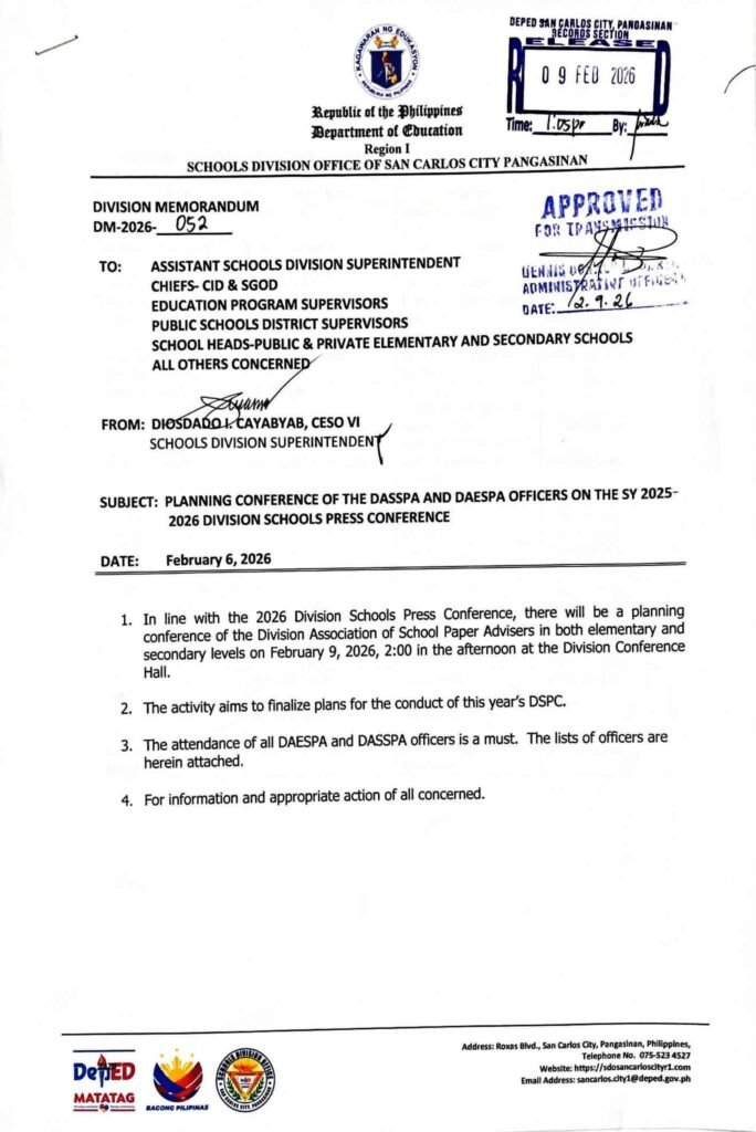 Division Memorandum No. 052 s, 2026 – PLANNING CONFERENCE OF THE DASSPA AND DAESPA OFFICERS ON THE SY 2025-2026 DIVISION SCHOOLS PRESS CONFERENCE