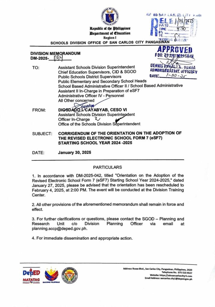 Division Memorandum No. 054 s, 2025 – CORRIGENDUM OF THE ORIENTATION ON THE ADOPTION OF THE REVISED ELECTRONIC SCHOOL FORM 7 (eSF7) STARTING SCHOOL YEAR 2024-2025