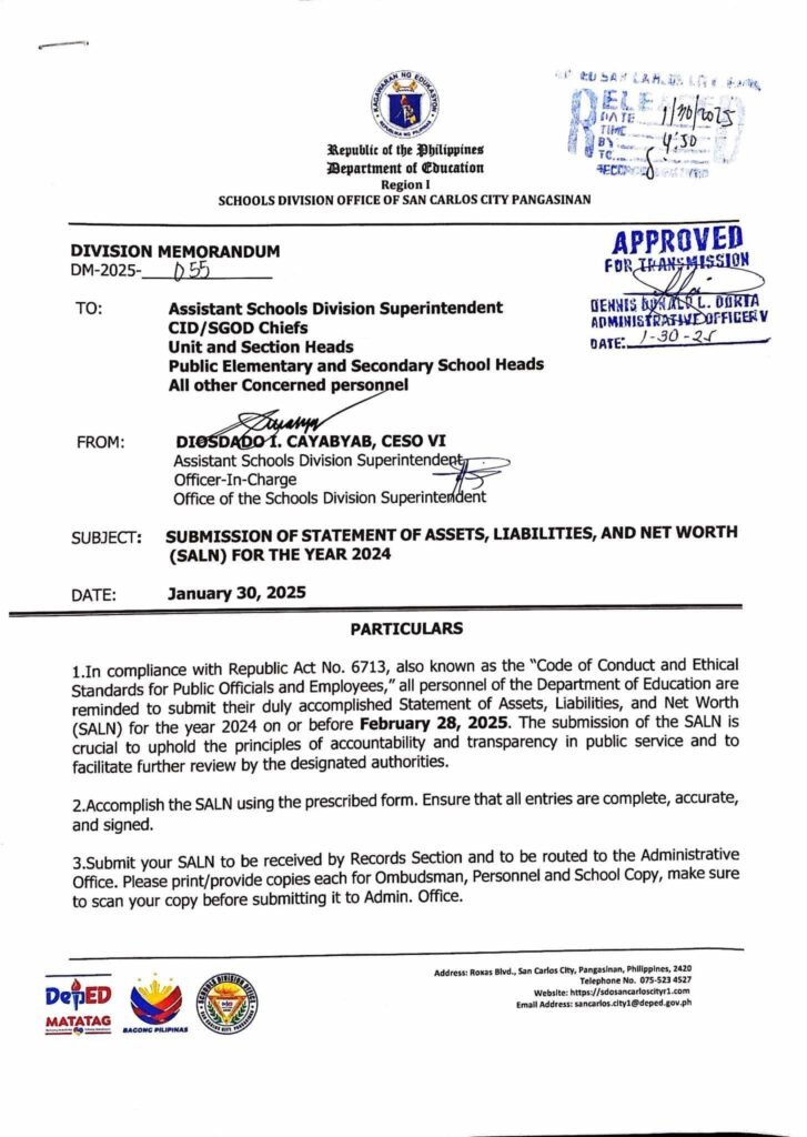 Division Memorandum No. 055 s, 2025 – SUBMISSION OF STATEMENT OF ASSETS, LIABILITIES, AND NET WORTH (SALN) FOR THE YEAR 2024