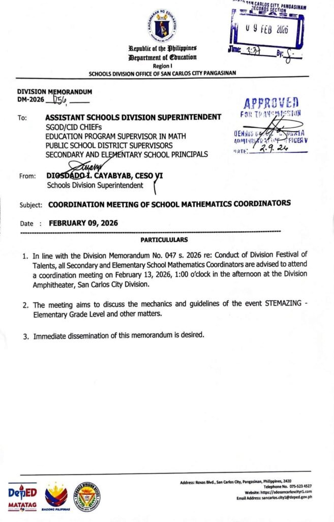 Division Memorandum No. 056 s, 2026 – COORDINATION MEETING OF SCHOOL MATHEMATICS COORDINATORS