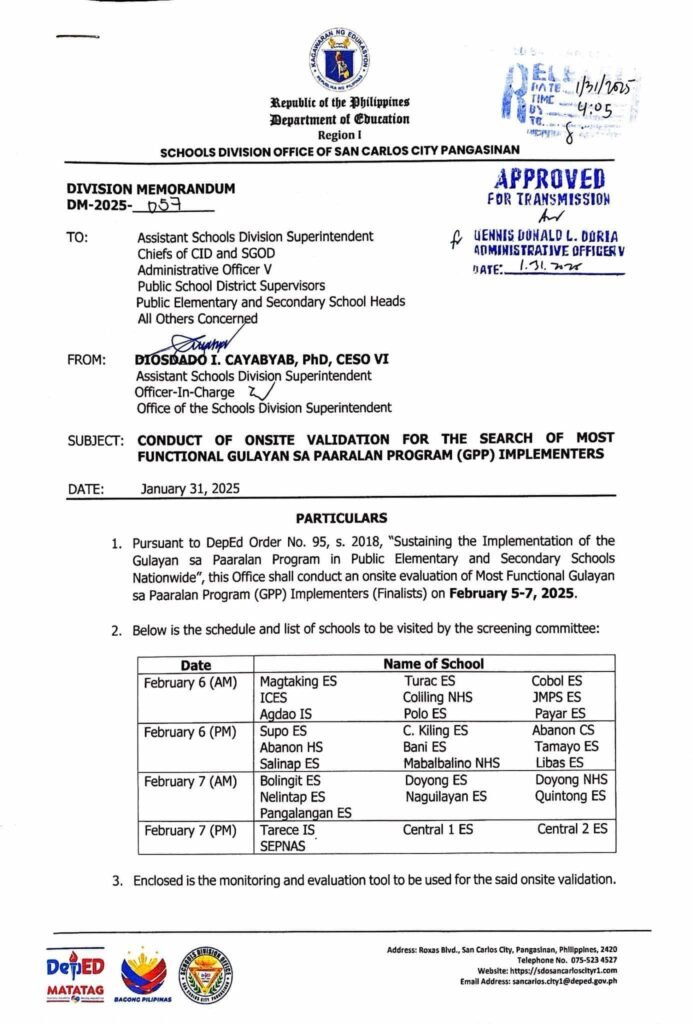 Division Memorandum No. 057 s, 2025 – CONDUCT OF ONSITE VALIDATION FOR THE SEARCH OF MOST FUNCTIONAL GULAYAN SA PAARALAN PROGRAM (GPP) IMPLEMENTERS