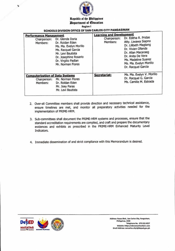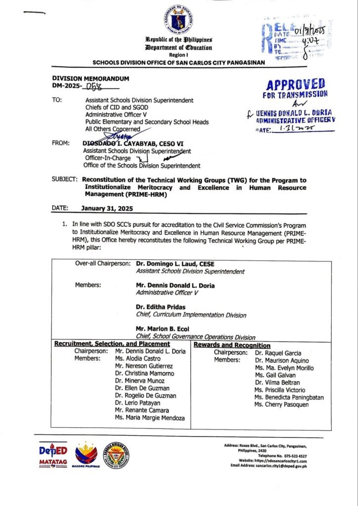 Division Memorandum No. 058 s, 2025 – Reconstitution of the Technical Working Groups (TWG) for the Program to Institutionalize Meritocracy and Excelience in Human Resource Management (PRIME-HRM)