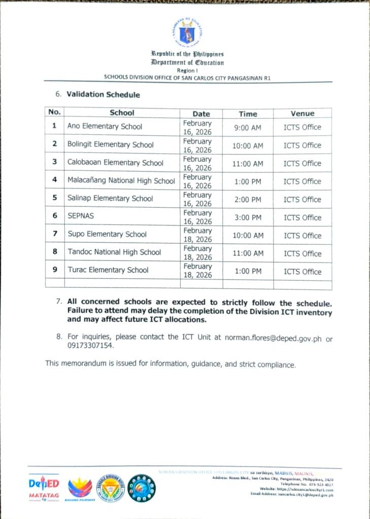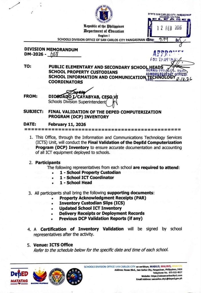 Division Memorandum No. 058 s, 2026 – FINAL VALIDATION OF THE DEPED COMPUTERIZATION PROGRAM (DCP) INVENTORY