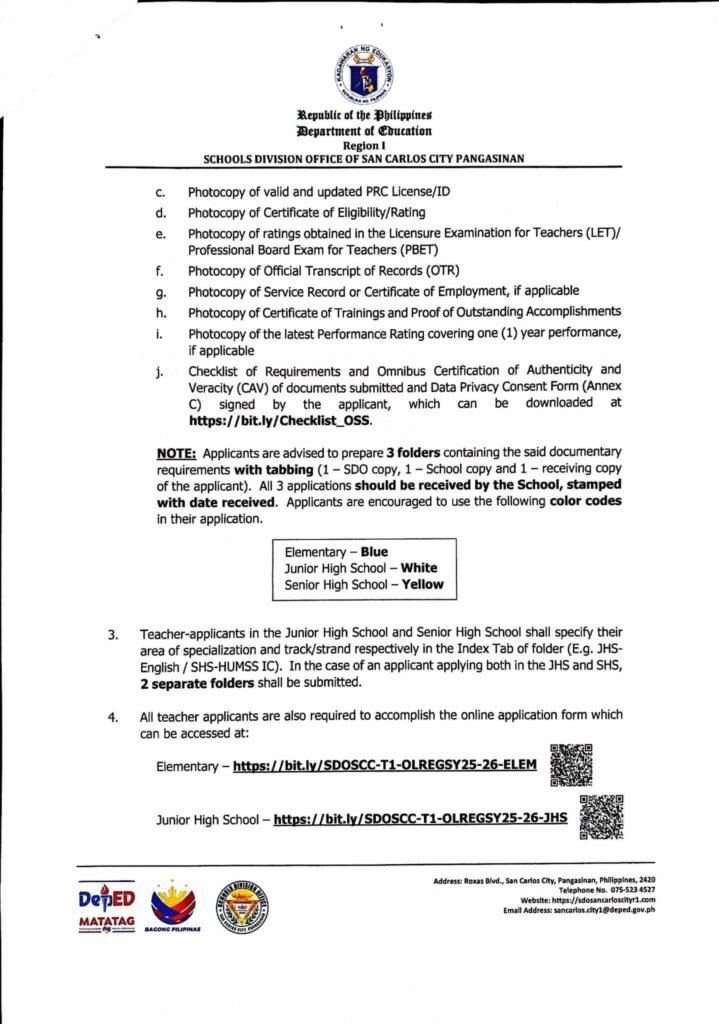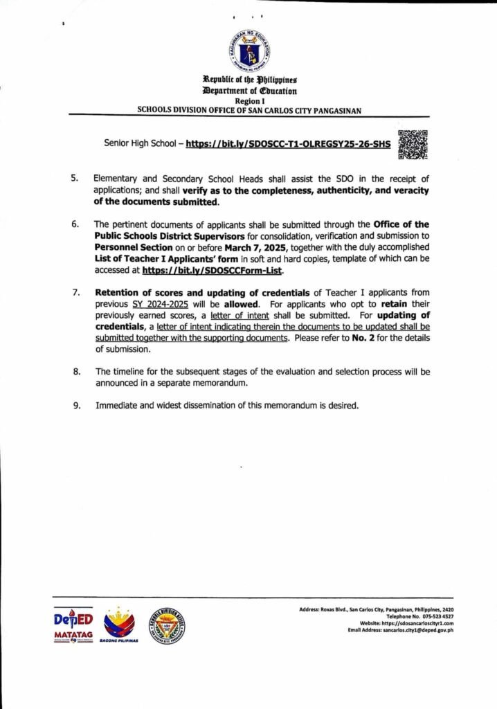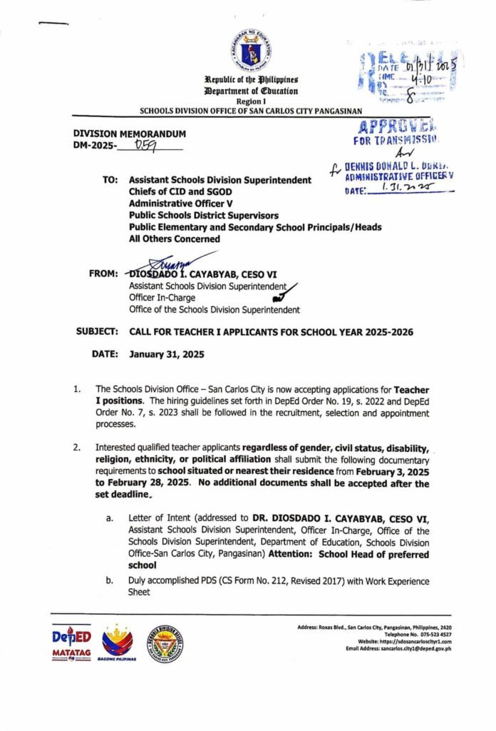 Division Memorandum No. 059 s, 2025 – CALL FOR TEACHER I APPLICANTS FOR SCHOOL YEAR 2025-2026