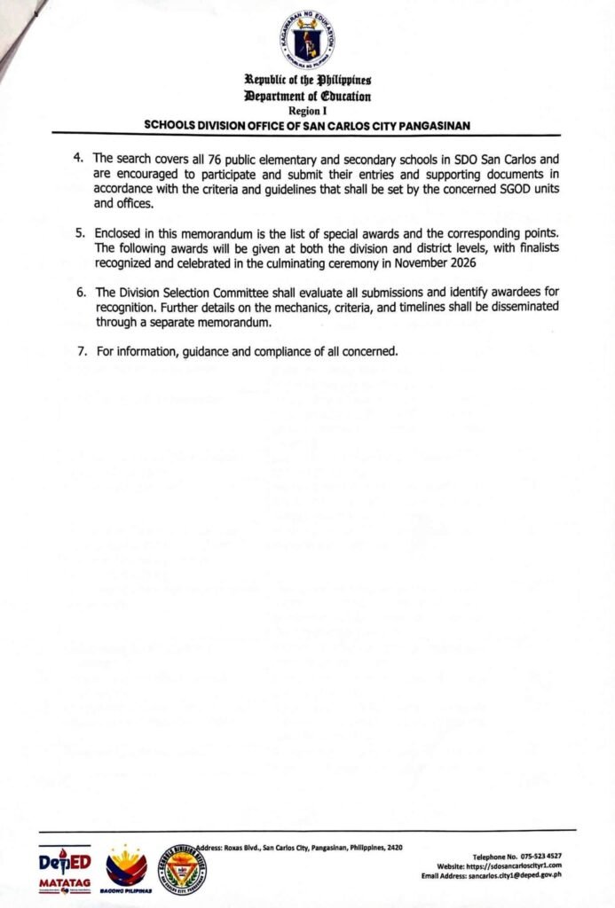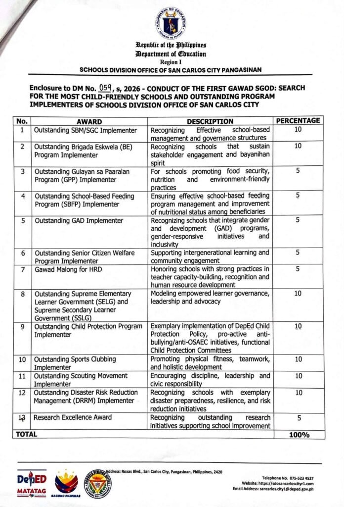 Division Memorandum No. 059 s, 2026 – CONDUCT OF THE FIRST GAWAD SGOD: SEARCH FOR THE MOST CHILD-FRIENDLY SCHOOLS AND OUTSTANDING PROGRAM IMPLEMENTERS OF SCHOOLS DIVISION OFFICE OF SAN CARLOS CITY