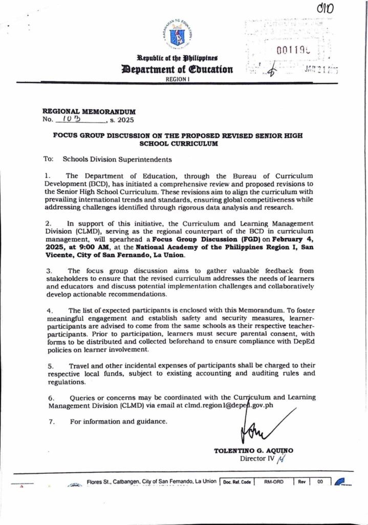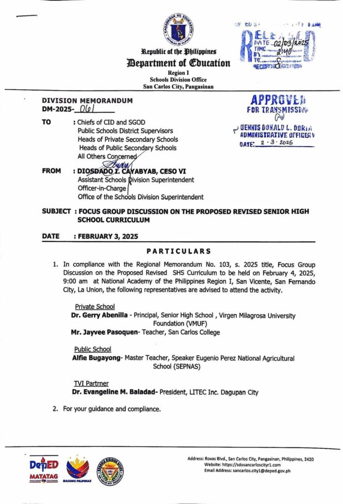 Division Memorandum No. 061 s, 2025 – FOCUS GROUP DISCUSSION ON THE PROPOSED REVISED SENIOR HIGH SCHOOL CURRICULUM