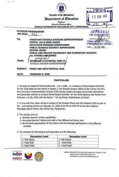Division Memorandum No. 062 s, 2026 – MUSIC AND ARTS FESTIVAL 2026