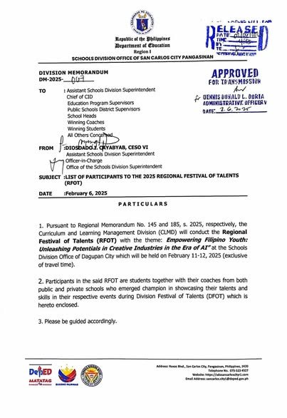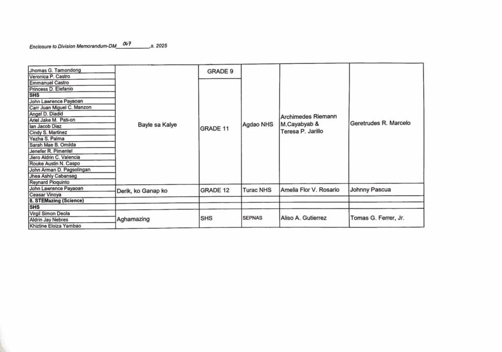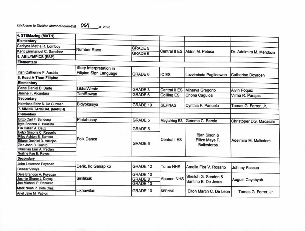 Division Memorandum No. 067 s, 2025 – LIST OF PARTICIPANTS TO THE 2025 REGIONAL FESTIVAL OF TALENTS (RFOT)