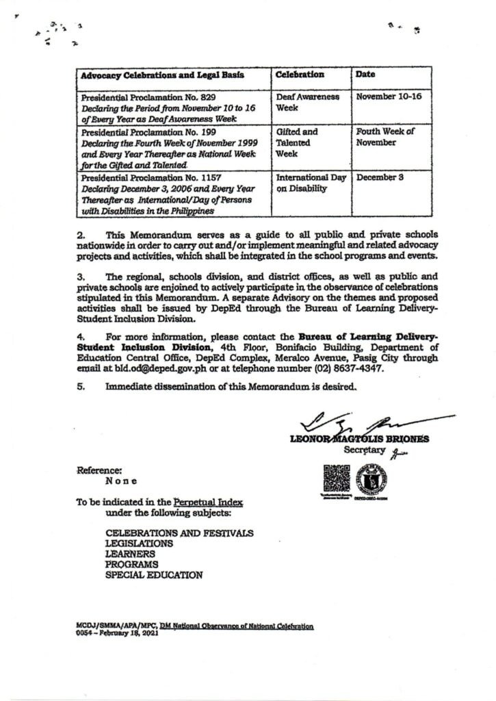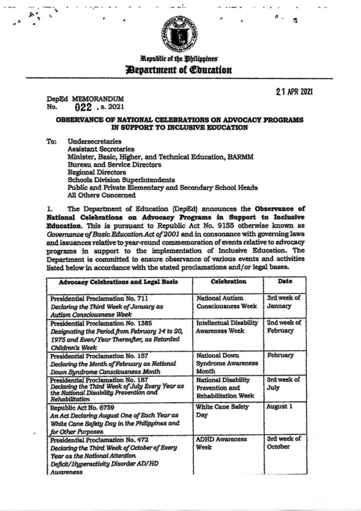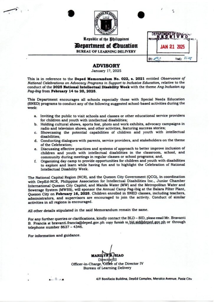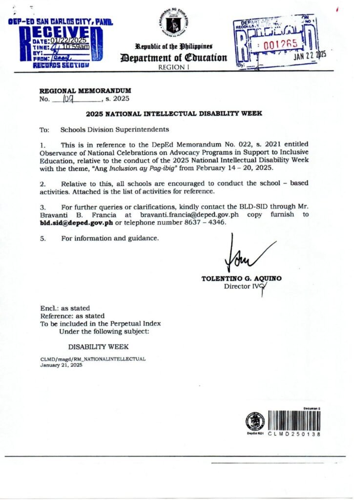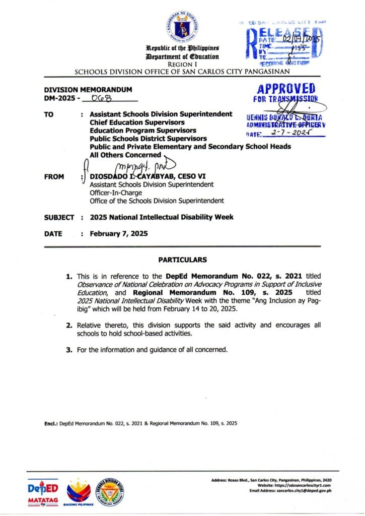 Division Memorandum No. 068 s, 2025 – 2025 National Intellectual Disability Week