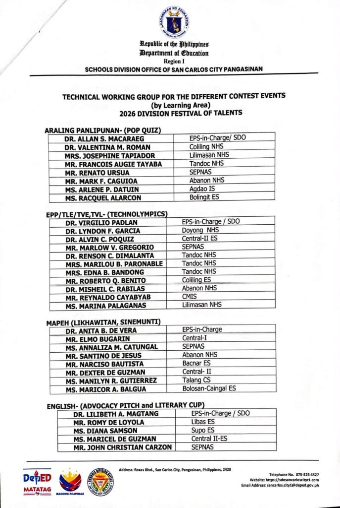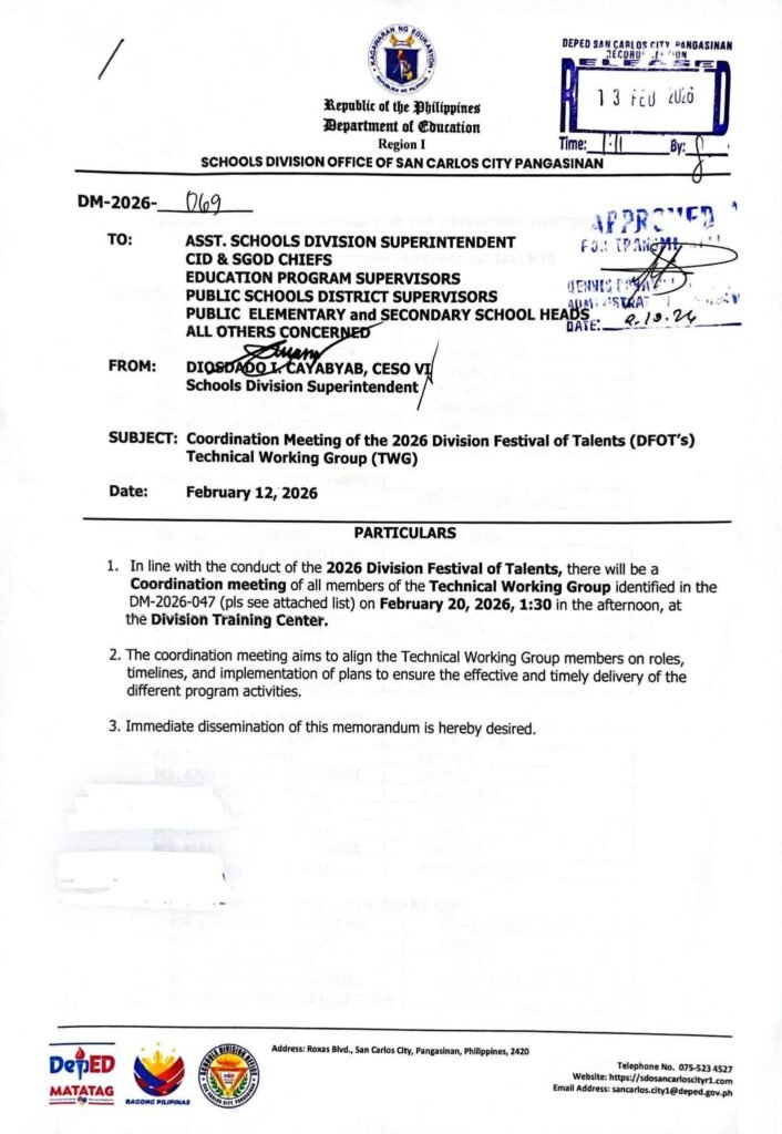 Division Memorandum No. 069 s, 2026 – Coordination Meeting of the 2026 Division Festival of Talents (DFOT’s) Technical Working Group (TWG)