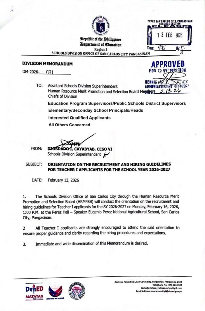 • Division Memorandum No. 071 s, 2026 – ORIENTATION ON THE RECRUITMENT AND HIRING GUIDELINES FOR TEACHER I APPLICANTS FOR THE SCHOOL YEAR 2026-2027