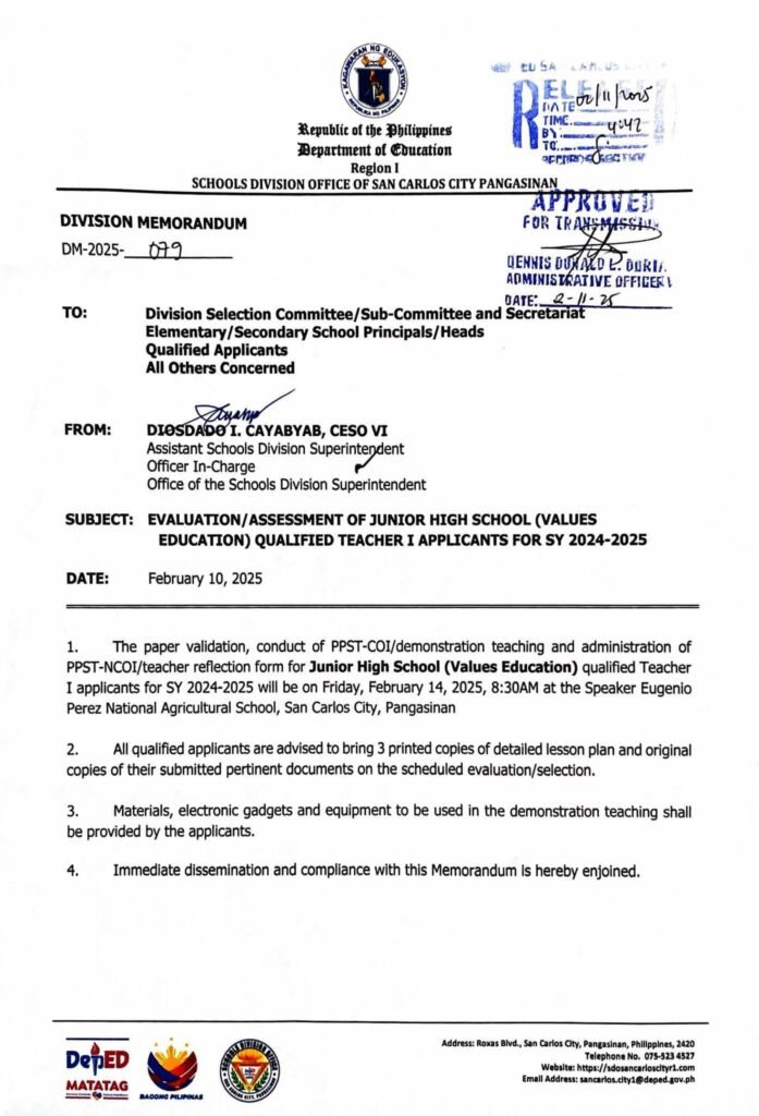 Division Memorandum No. 079 s, 2025 – EVALUATION/ASSESSMENT OF JUNIOR HIGH SCHOOL (VALUES EDUCATION) QUALIFIED TEACHER I APPLICANTS FOR SY 2024-2025
