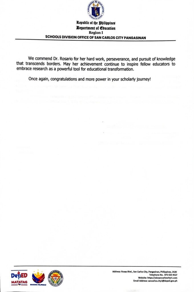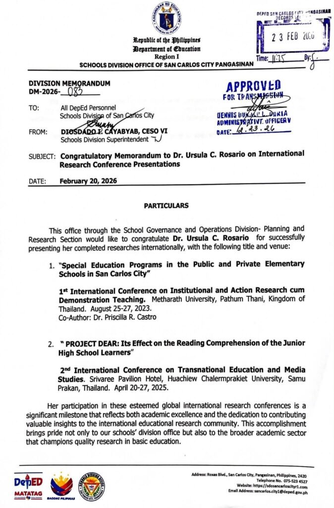 Division Memorandum No. 083 s, 2026 – Congratulatory Memorandum to Dr. Ursula C. Rosario on International Research Conference Presentations