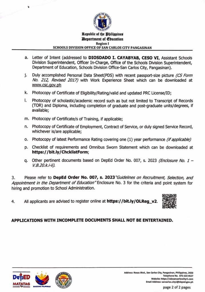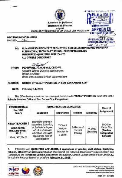 Division Memorandum No. 086 s, 2025 – NOTICE OF VACANT POSITION IN SDO-SAN CARLOS CITY