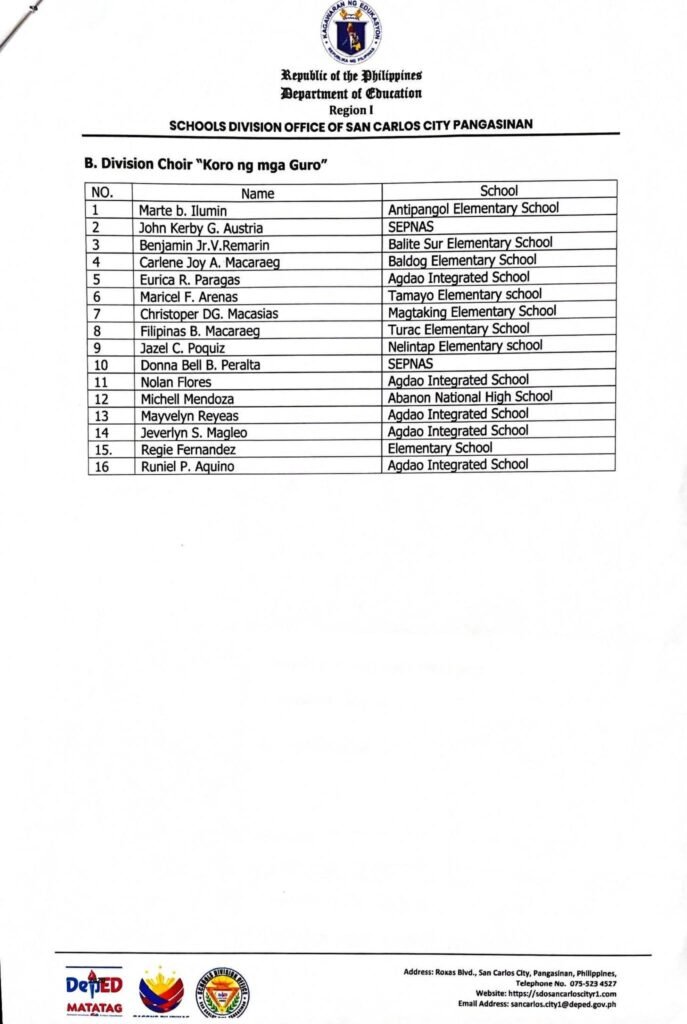 Division Memorandum No. 087 s, 2026 – COORDINATION MEETING OF TECHNICAL WORKING GROUP (TWG) AND PRACTICE OF THE DIVISION CHOIR “KORO NG MGA GURO” FOR THE MUSIC AND ARTS’ FESTIVAL 2026