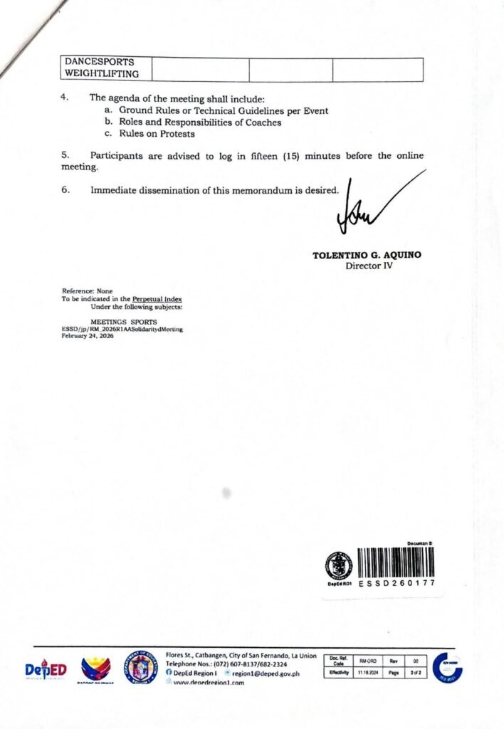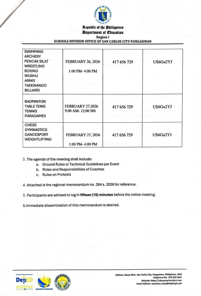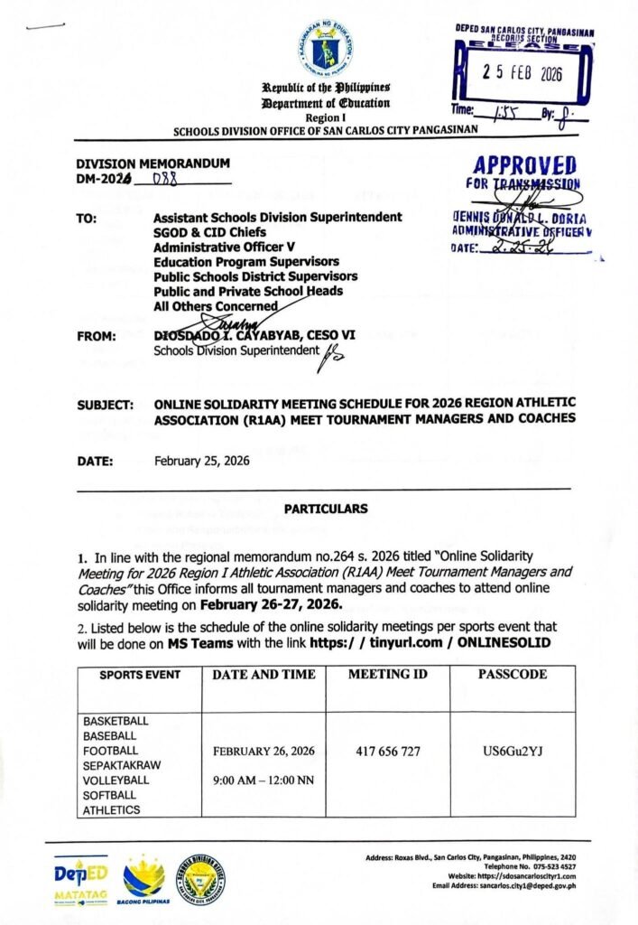 Division Memorandum No. 088 s, 2026 – ONLINE SOLIDARITY MEETING SCHEDULE FOR 2026 REGION ATHLETIC ASSOCIATION (RAA) MEET TOURNAMENT MANAGERS AND COACHES
