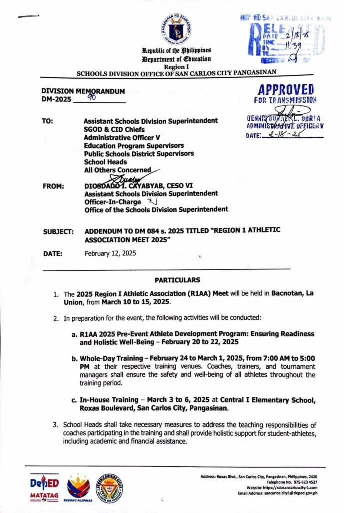 Division Memorandum No. 090 s, 2025 – ADDENDUM TO DM 084 s, 2025 TITLED “REGION 1 ATHLETIC ASSOCIATION MEET 2025”