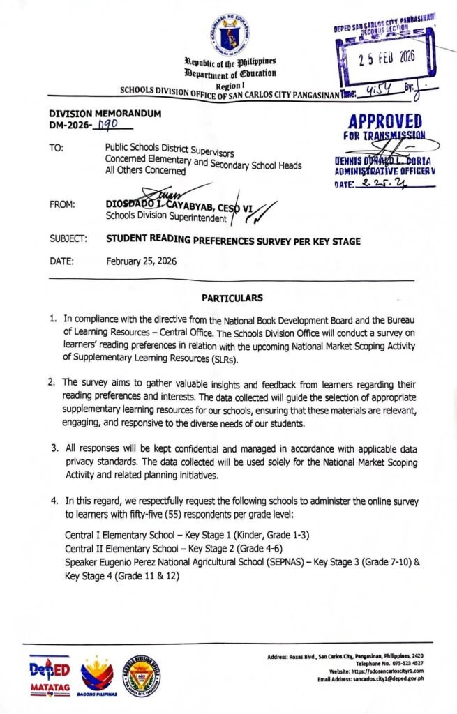 Division Memorandum No. 090 s, 2026 – STUDENT READING PREFERENCES SURVEY PER KEY STAGE