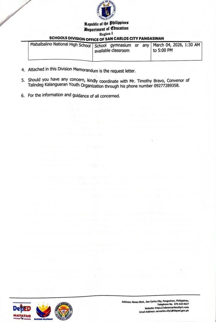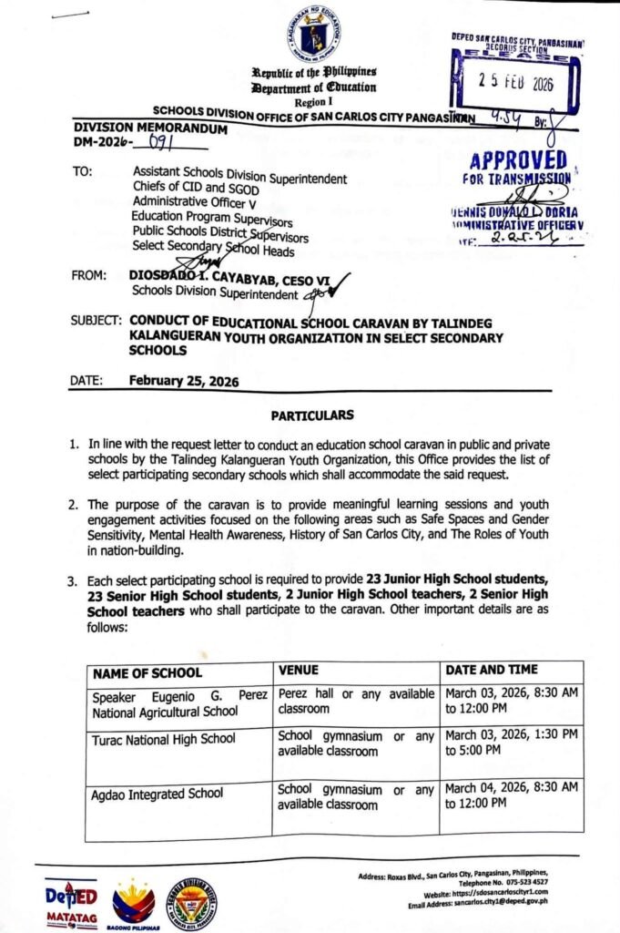 Division Memorandum No. 091 s, 2026 – CONDUCT OF EDUCATIONAL SCHOOL CARAVAN BY TALINDEG KALANGUERAN YOUTH ORGANIZATION IN SELECT SECONDARY SCHOOLS