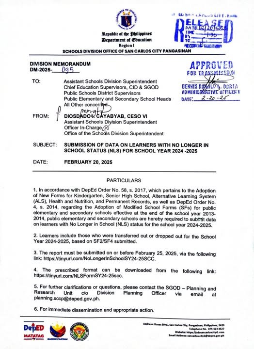 Division Memorandum No. 095 s, 2025 – Submission of Data on Learners with No Longer in School Status (NLS) for School Year 2024-2025