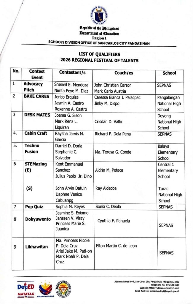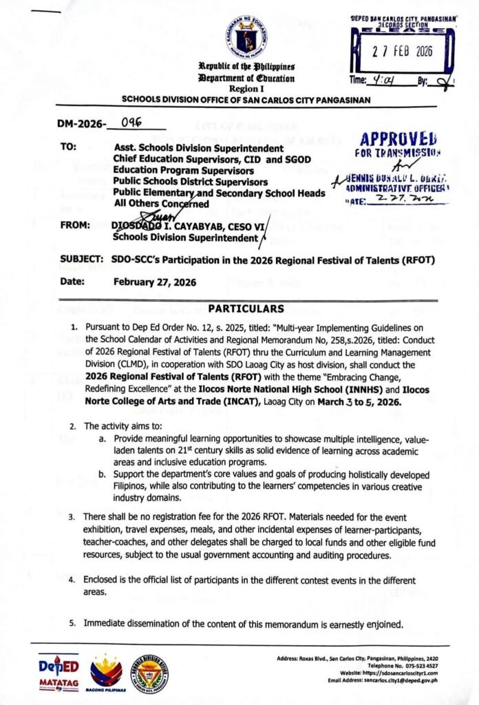 • Division Memorandum No. 096 s, 2026 – SDO-SCC’s Participation in the 2026 Regional Festival of Talents (RFOT)