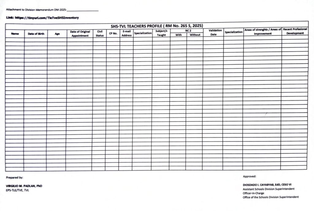 Division Memorandum No. 097 s, 2025 – Submission of JHS-TLE/TVE and SHE TVL Teachers’ Profile