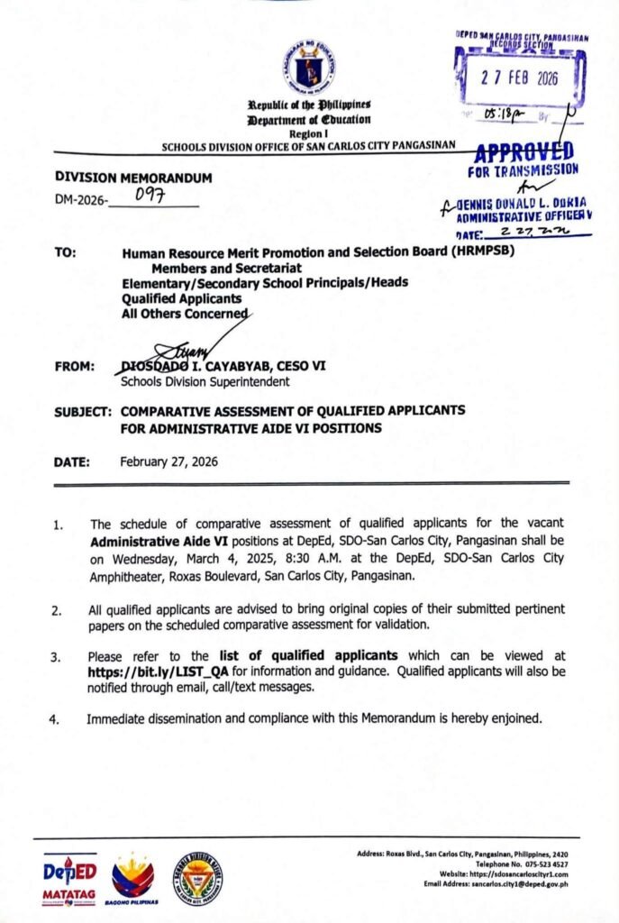 Division Memorandum No. 097 s, 2026 – COMPARATIVE ASSESMENT OF QUALIFIED APPLICANTS FOR ADMINISTRATIVE AIDE VI POSITIONS