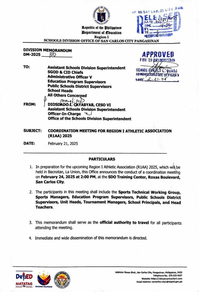 Division Memorandum No. 100 s, 2025 – COORDINATION MEETING FOR REGION I ATHLETIC ASSOCIATION (R1AA) 2025